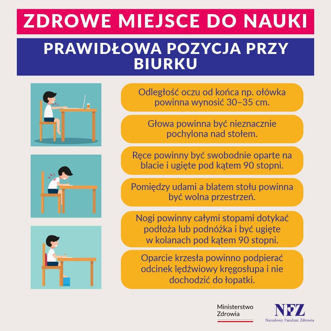 utrzymywało prawidłową postawę przy biurku, z prostymi plecami, stopami opartymi o podłogę i łokciami podpartymi na blacie.