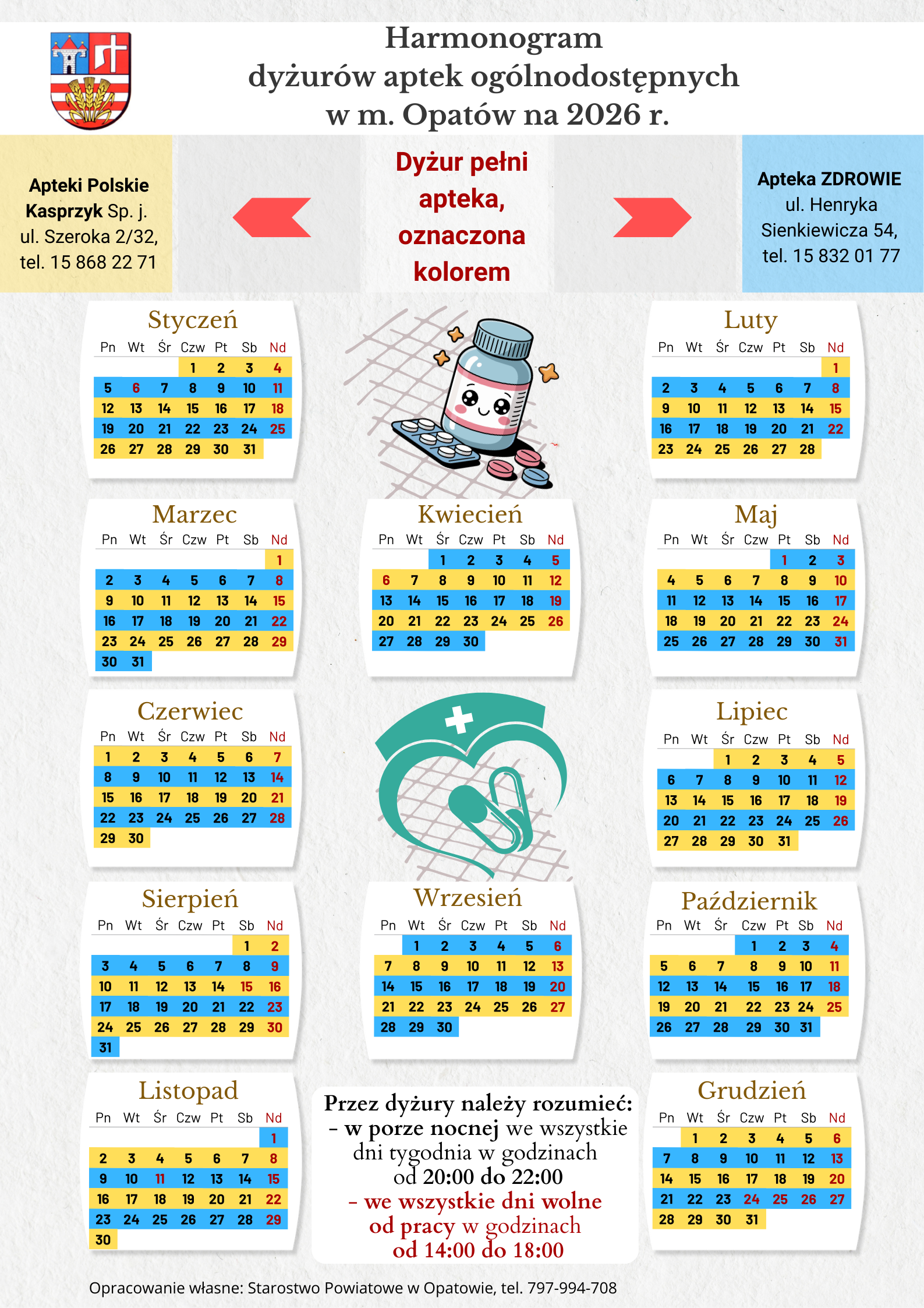 Informujemy, że uchwałą Nr 71.68.2025 Zarządu Powiatu w Opatowie z dnia 5 listopada 2025 r., do samodzielnego pełnienia dyżurów w porze nocnej oraz w dni wolne od pracy w roku 2026, zmienionej uchwałą Nr 80.90.2025 z dnia 15 grudnia 2025 r. wyznaczył dwie apteki ogólnodostępne: