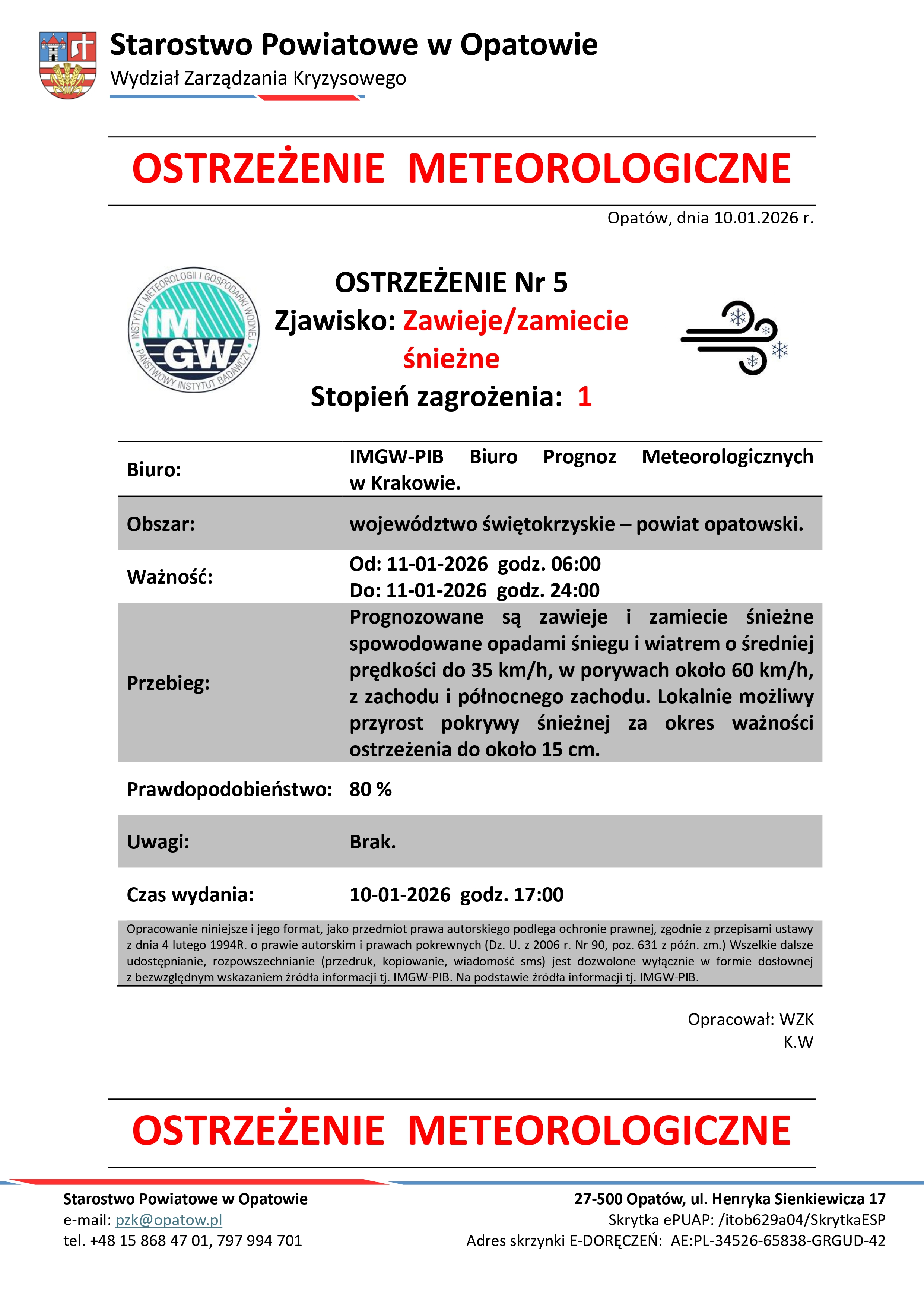 Ostrzeżenie meteorologiczne - Zawieje/zamiecie śnieżne (okres obowiązywania: 11.01.2026 r.)