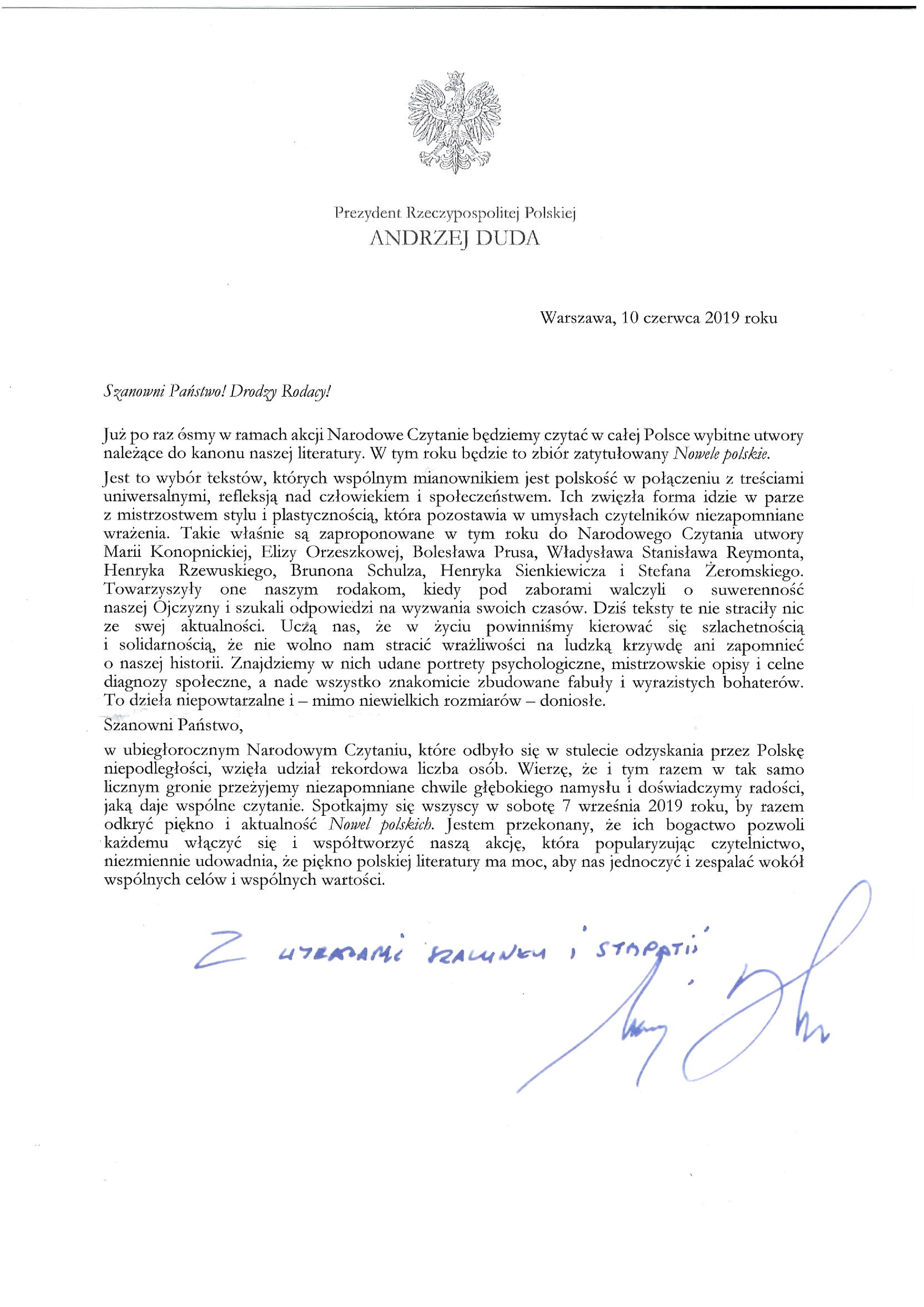 Narodowe Czytanie to akcja organizowana przez Prezydenta RP od 2012 roku. W czasie ósmej edycji lekturą będzie zbiór zatytułowany Nowele polskie. Wspólne ogólnopolskie czytanie odbędzie się 7 września 2019 roku.