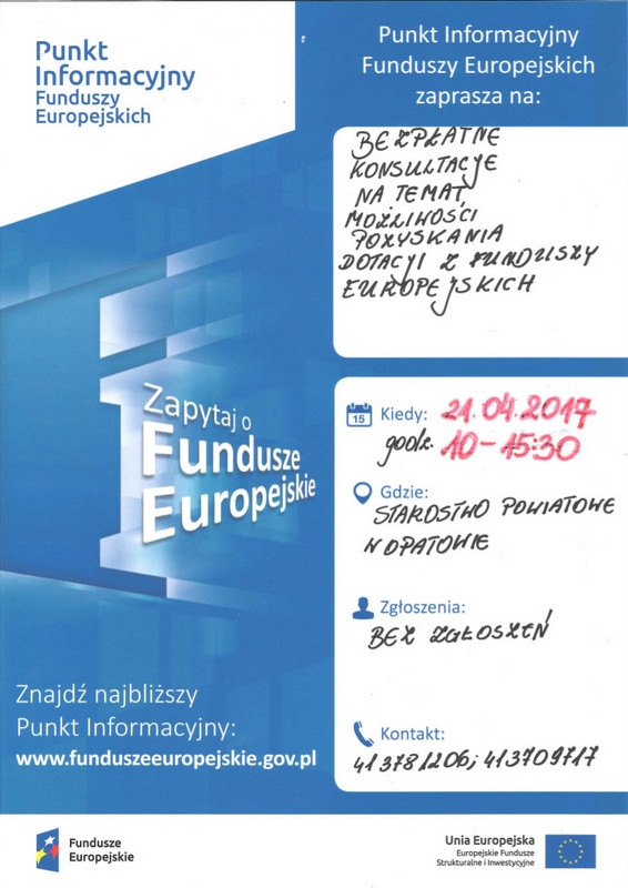 Ogłoszenie w sprawie bezpłatnych konsultacji z możliwości pozyskania dotacji w ramach funduszy europejskich