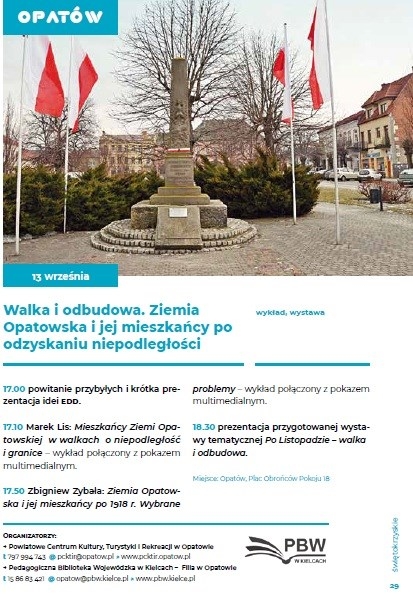 Powiatowe Centrum Kultury, Turystyki i Rekreacji w Opatowie oraz Biblioteka Pedagogiczna w Opatowie zapraszają na kolejną edycję Europejskich Dni Dziedzictwa. W tym roku przebiegają one pod hasłem „Polski splot”, które wpisuje się w wieloletnie obchody upamiętnienia 100.rocznicy odzyskania przez Polskę Niepodległości. W programie są dwa wykłady opatowskich regionalistów – Marka Lisa i Zbigniewa Zybały, wzbogacone o prezentacje multimedialne oraz okolicznościową wystawę tematyczną.
