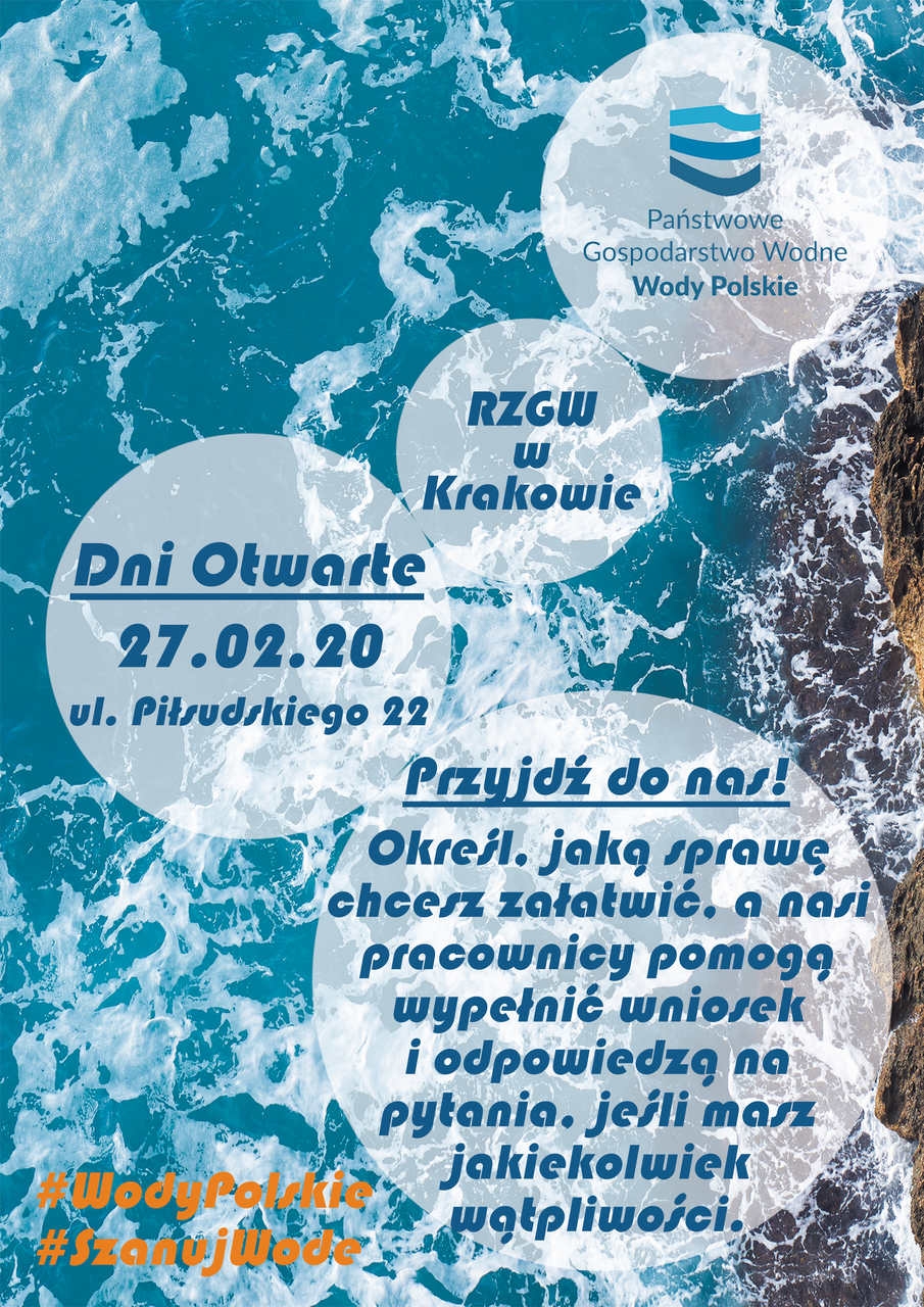 Państwowe Gospodarstwo Wodne Wody Polskie Regionalny Zarząd Gospodarki Wodnej w Krakowie zaprasza do udziału w Dniach Otwartych 27 lutego. W każdy ostatni czwartek miesiąca, w godzinach od 8.00 do 14.00, nasi pracownicy będą udzielać wszelkich informacji oraz porad związanych z gospodarką wodną - odpowiedzą na Państwa pytania, pomogą wypełnić wniosek, sprawdzą niezbędną dokumentację.