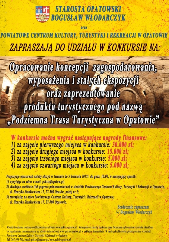 Starosta Opatowski, Bogusław Włodarczyk oraz Powiatowe Centrum Kultury, Turystyki i Rekreacji w Opatowie zapraszają wszystkich zainteresowanych do uczestnictwa w konkursie na opracowanie koncepcji zagospodarowania, wyposażenia i stałych ekspozycji oraz zaprezentowanie produktu turystycznego pod nazwą „Podziemna Trasa Turystyczna w Opatowie".