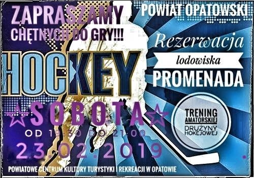 Zapraszamy wszystkich, którzy chcą spróbować swoich sił w hokeju, do wspólnej zabawy i udziału w naszych rozgrywkach. SOBOTA, 23 lutego, GODZINA 19:30 do 20:30. Lodowisko na Placu Rekreacyjno - Wypoczynkowym przy Promenadzie w Opatowie.